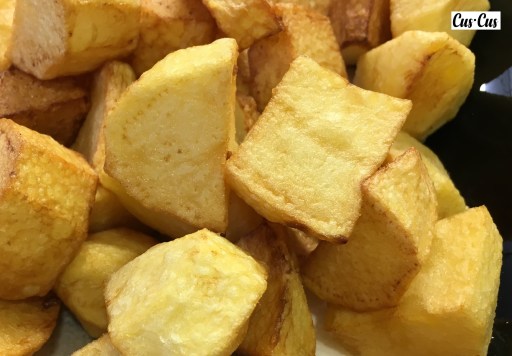 4. Cortamos las patatas en dados medianos y freímos en aceite virgen extra. Dejamos sólo que se doren un poco, ya que se terminarán de hacer en el horno.