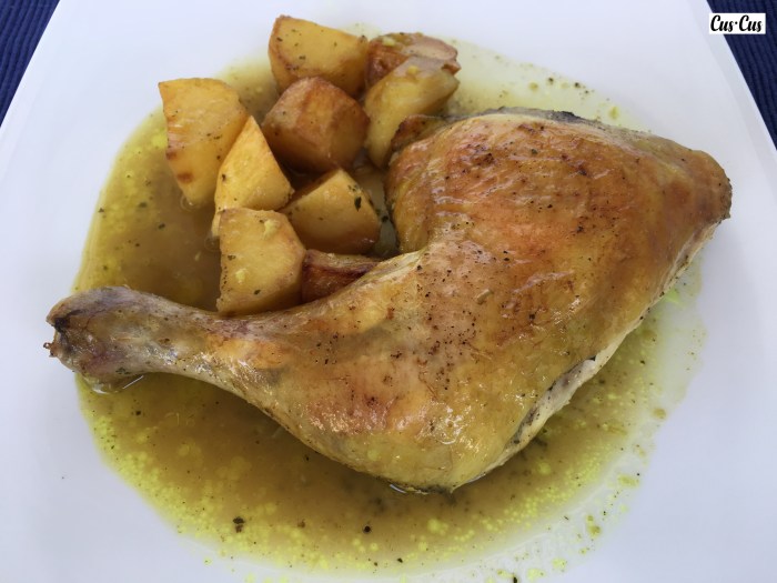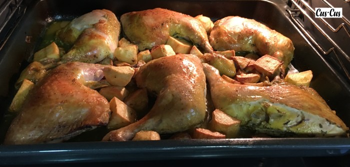 5. Damos la vuelta al pollo y añadimos las patatas remojándolas en el caldo. Horneamos otros 30-40 min hasta que esté la piel tostada.