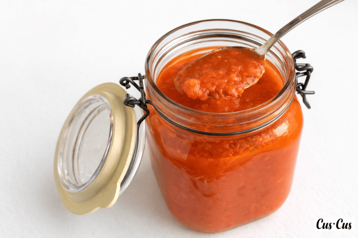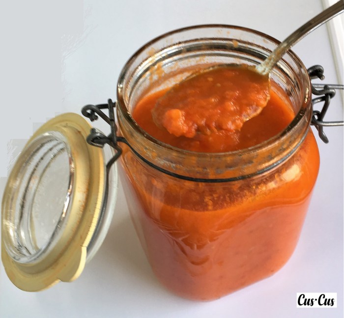 4. Añadimos el tomate frito caliente en botes de cristal para conservas, tapamos con film transparente para que no se escape nada y cerramos con su tapa. Damos la vuelta para que se haga el vacío y se conserve por meses… ¡¡aunque no dura tanto!!