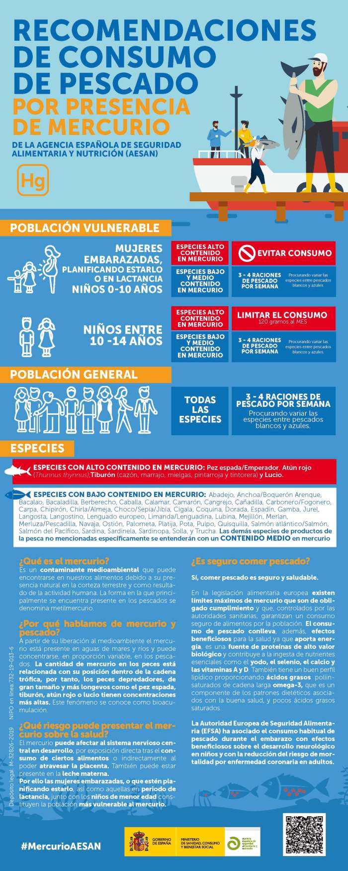 Además de esta restricción, en 2017 (fecha en la cual escribimos este post) la recomendación era evitar el consumo de emperador, pez espada, tiburón y atún rojo (pescados grandes, en general) durante los 3 primeros años de vida de los niños. A finales de 2019 las recomendaciones son EVITAR EL CONSUMO DE LAS ESPECIES CON ALTO CONTENIDO EN MERCURIO HASTA LOS 10 AÑOS; y también evitarlo en MUJERES EMBARAZADAS O LACTANTES.