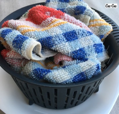 1. Ponemos centrado un trapo de toalla limpio sobre un colador (nosotros usamos el cestillo de Thermomix®).