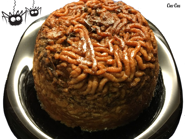 1. Para conseguir la forma de sesos usamos un bol redondo y lo cubrimos de caramelo. Colocamos una capa de carne picada comprada con la forma de hilos.