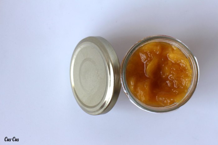 Nuestras mermeladas se caracterizan por la poca cantidad de azúcar que les echamos, con lo cual, han de ser consumidas en un periodo de tiempo breve. Normalmente las recetas recomiendan echar, mínimo, la mitad de azúcar que de fruta. Es decir, por 1 kilo de fruta, se echa 1/2 de azúcar. A nosotros esto nos resulta muy dulce, y como no hemos experimentado con otros edulcorantes, le solemos echar 1/3 del peso total. Aunque esto también depende de la fruta; por ejemplo, para frutas muy ácidas como el lulo o el maracuyá sí que solemos echar la mitad de azúcar.