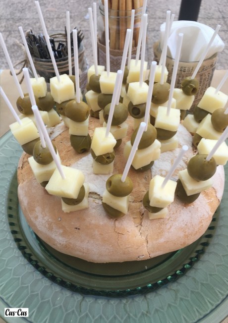 2. Pinchamos en los palitos de brocheta los trozos de queso y aceitunas alternados.