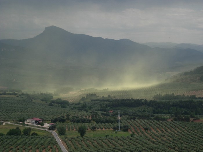 Este mar de olivos, más de 66 millones, ahora en primavera suelta su polen, muchos de nosotros ya estamos inmunizados, pero no siempre es así y hay jiennenses que padecen grandes problemas de alergia por los niveles tan altos de polen que nos rodean. En la imagen podéis ver una nube de polen que deja nuestras terrazas de color amarillo.