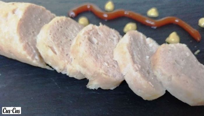 - Si no tenemos Thermomix®, podemos triturar los ingredientes en la batidora, y las salchichas se pueden cocer en una olla con el accesorio para cocinar al vapor. Que tampoco tenemos este accesorio, las podemos cocer en una sartén, incluso con un chorreón de vino, que les dará un toque distinto. Una vez cocidas, les quitamos el film.