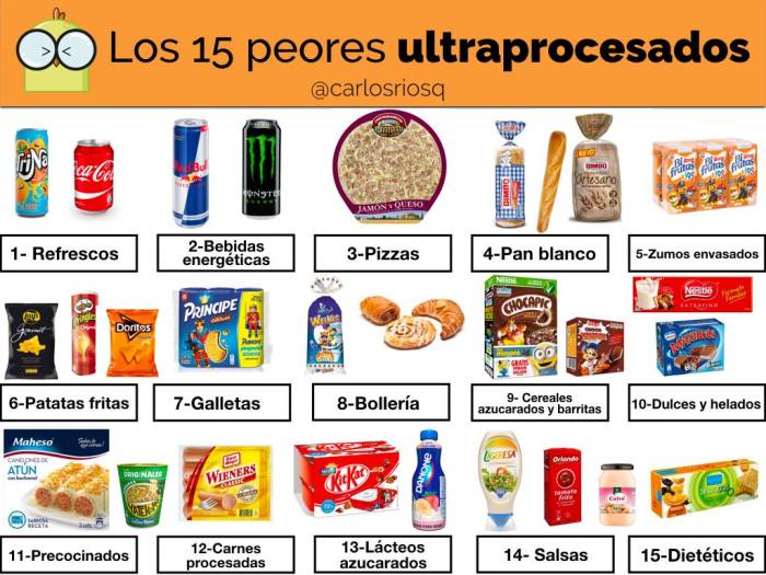 Carlos Ríos nos indica en su infografía que «no están ordenados de peor a mejor, ni de mejor a peor. Todos son lo peor». Según él, los productos más dañinos para nuestra salud y que están en el top 10 de los “alimentos” más frecuentemente consumidos por los españoles son: