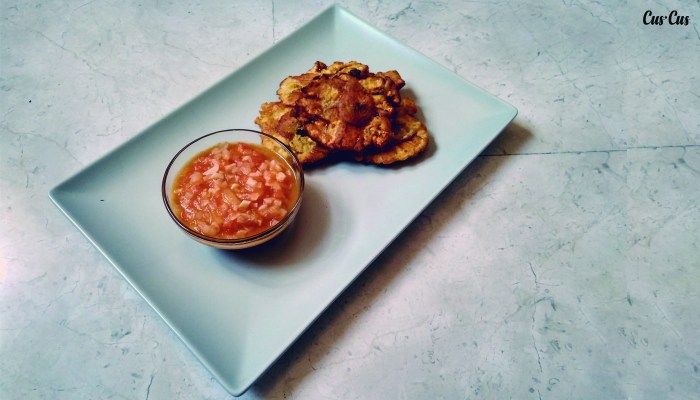 - Sacamos los trozos, los ponemos en papel de cocina para que absorba el aceite sobrante y aplastamos el patacón hasta formar una especie de chip grueso. Nosotros los aplastamos con la tortillera que nos regaló nuestra querida mexicana (por ello nos impide llamarla pataconera, como se conoce en Colombia). También podéis aplastarlos con un rodillo de cocina o con un vaso.
