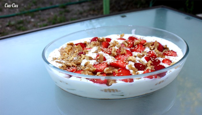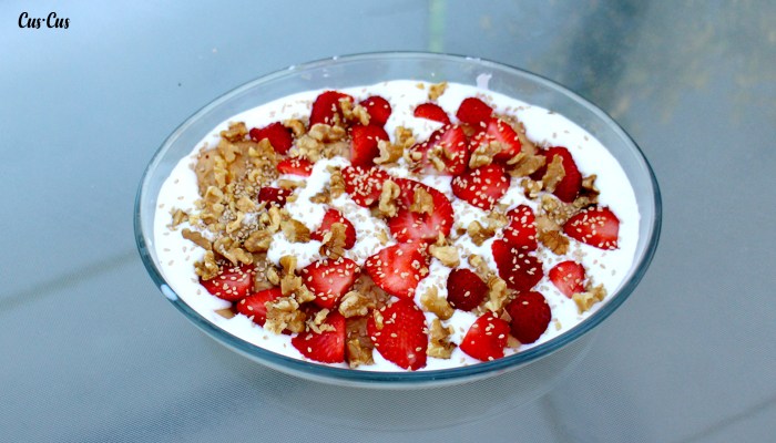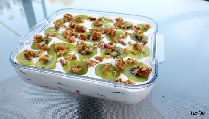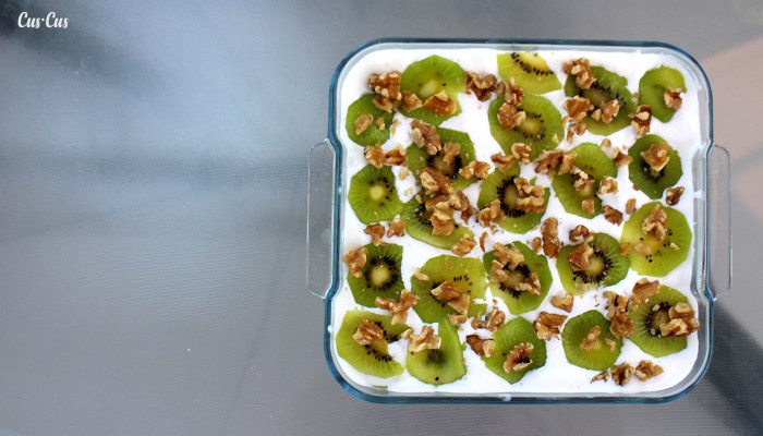 - ¡Y volvemos a repetir la operación! Galletas + fruta + nata. Así hasta llenar el molde que tengamos. Podemos terminar la decoración con una capa de fruta y finalmente colocar las nueces (las cuales también podéis añadir entre capas si os apetece).