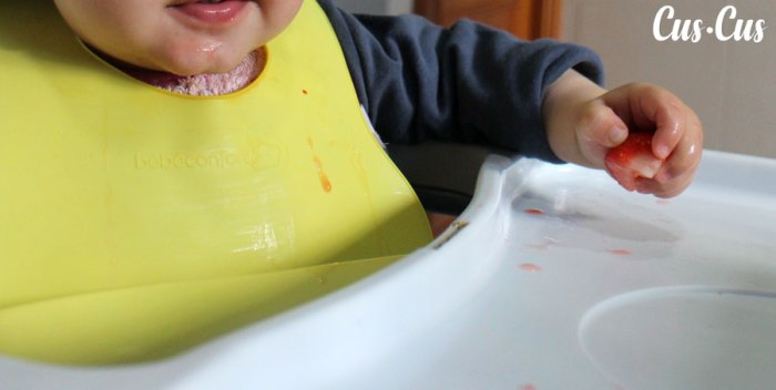 A lo que íbamos… el enano empezó a manipular alimentos, a mejorar su capacidad motora haciendo la pinza, a ejercitar la musculatura de la boca y a mejorar el reflejo extrusivo… Como explica Jesús, «ninguna estrategia elimina por completo el riesgo de atragantamiento, pero en mi opinión, ésta lo reduce claramente».