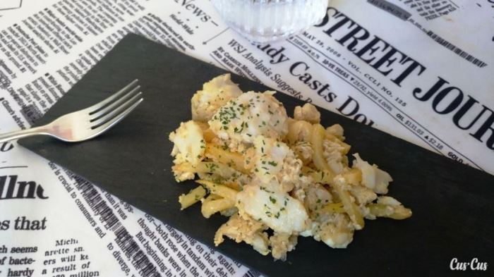 Conforme vayáis leyendo la receta, os daréis cuenta por qué le hemos puesto apellido a la receta: hemos cambiado el bacalao en salazón por bacalao normal, las patatas están cortadas finamente pero no llegan a ser paja y no llevan aceitunas negras. Vamos… que hemos cambiado la receta por completo, así que ésta se va a quedar como la versión Cus•Cus… Aunque tiene delito que no le hayamos puesto las aceitunas, jajajaja.