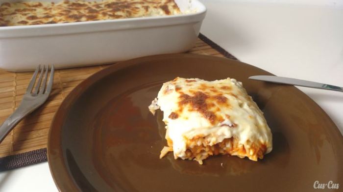 - Vamos colocando cada canelón sobre una bandeja de horno ligeramente untada con tomate frito. Una vez rellenos y colocados todos los canelones, cubrimos con la salsa bechamel y espolvoreamos con queso rallado.