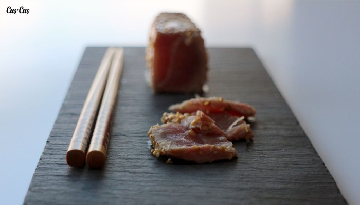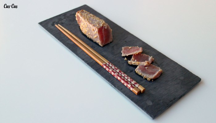 El tataki consiste en macerar el pescado y pasarlo después por la sartén rápidamente para sellarlo. Es una receta rápida y muy fácil de hacer. Y si conseguís el atún a buen precio, es la receta perfecta para una cenita romántica.