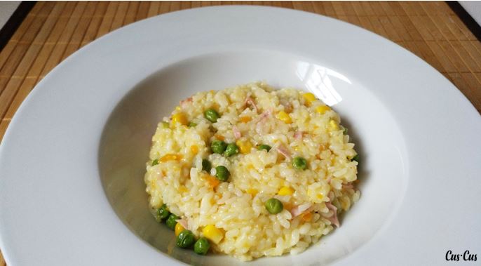 - A falta de 2 minutos, añadimos el jamón o pavo y los guisantes.