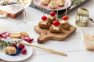 - Croquetas de jamón con queso rebozado en frutos secos y piña.