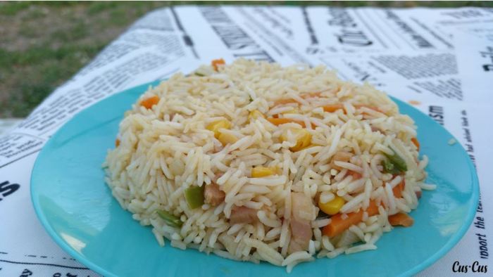 Este arroz es otra «salvacena» en casa CusCus, aunque también lo podemos utilizar como acompañamiento. Es una variante del arroz 3 delicias. Varían algunas verduras, no lleva tortilla ni gambas, y la soja y el curry le da un toque asiático que a nosotros nos encanta.