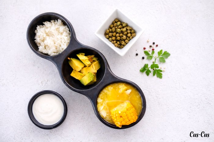 Para el acompañamiento del ajiaco, cortaremos los aguacates y los colocaremos en un plato; las alcaparras y la crema de leche (nata) las pondremos en dos cuencos independientes para que cada uno se sirva las cantidades que más le gusten.