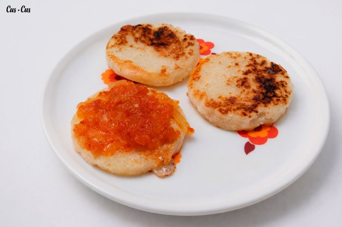 - Calentamos la sartén a fuego fuerte con un poquito de aceite de oliva y cuando esté bien caliente, la ponemos a fuego lento. Entonces echamos las arepas y cocinamos hasta que el disco se dore por un lado y luego lo volteamos hasta que esté dorado por el otro 🙂