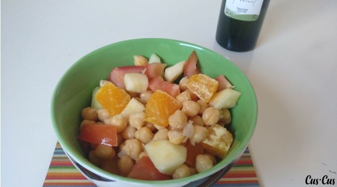 - Troceamos el resto de ingredientes a nuestro gusto y echamos a una ensaladera. Vertemos los garbanzos. Aliñamos con AOVE y listo.