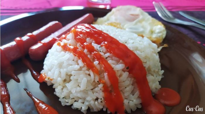 - Retiramos el Varoma y emplatamos el arroz acompañándolo con 2 salchichas y un huevo. Vertemos el tomate frito casero por encima y ¡listo!.