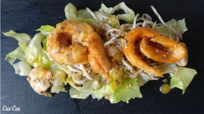 - Para emplatar, ponemos una cama de lechuga troceada, encima colocamos las gulas y las gambas y por último, el enrollado de merluza cortado en rodajas. Finalmente, rociamos con la salsa de naranja y decoramos con mezcla de semillas.