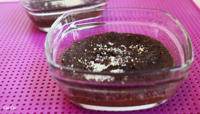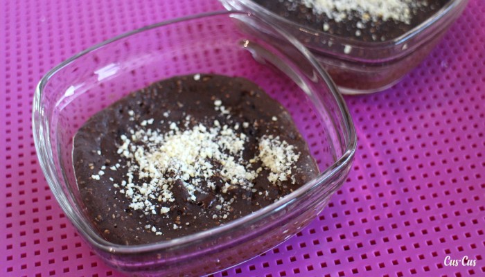 - Mezclar con la batidora o con la Thermomix el resto de ingredientes: la chía, los plátanos, la manzana, el cacao en polvo, la canela y el bicarbonato.