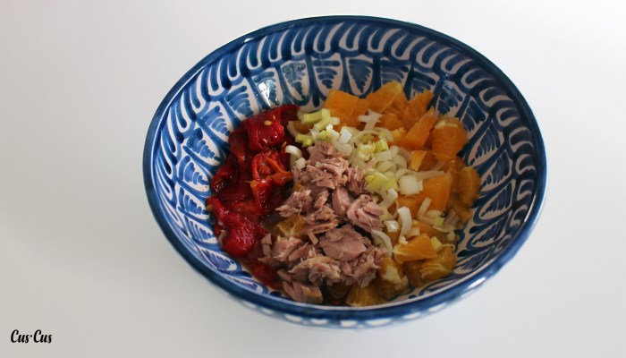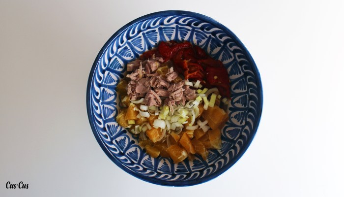 - Para la ensalada trocea el resto de ingredientes (el puerro o la cebolleta muy, muy picaditos).