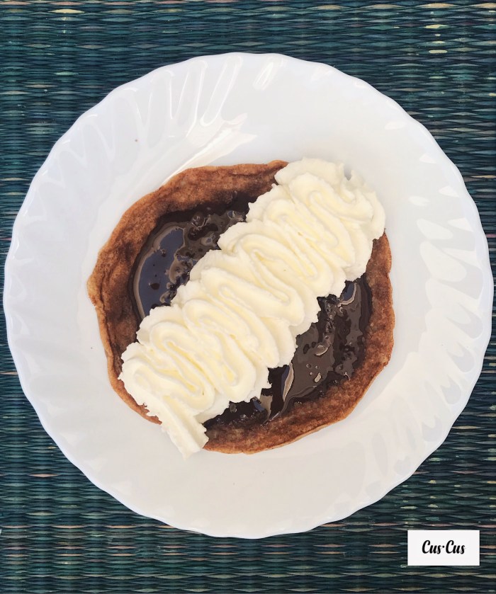 - Estas tortitas se acompañaron de chocolate fundido y nata, pero pueden acompañarse con miel, mermelada, frutas, frutos secos,etc.