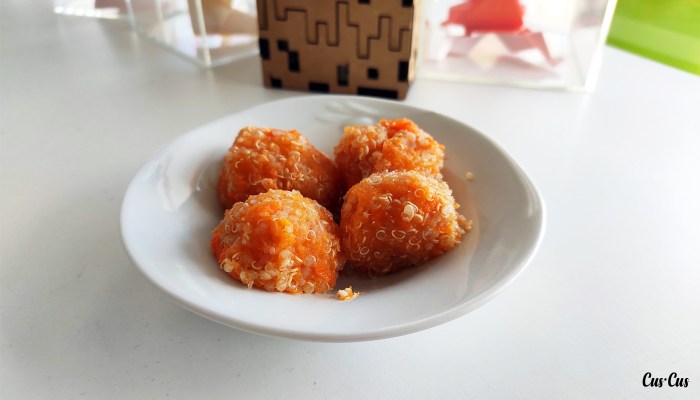 ¿Recordáis nuestras bolitas de batata y coco para el Día de Todos los Santos? Pues nos hemos preguntado si podríamos hacerlas de otras maneras para ofrecérselas a los peques durante sus primeros meses de alimentación complementaria con el método BLW ¡y nos han quedado de lujo! Es más, nosotros las usamos para picotear. Las hacemos indistintamente con fruta o verdura, y usamos cuscús, cuscús integral, arroz integral, harina de avena, harina de almendra, avena molida, quinoa… ¡las posibilidades son infinitas! Una vez hechas, os recomendamos dejarlas en el frigo mínimo media hora para que las manipulen bien y no se deshagan demasiado. Además, les vendrán de lujo fresquitas si les están saliendo los primeros dientes 🙂