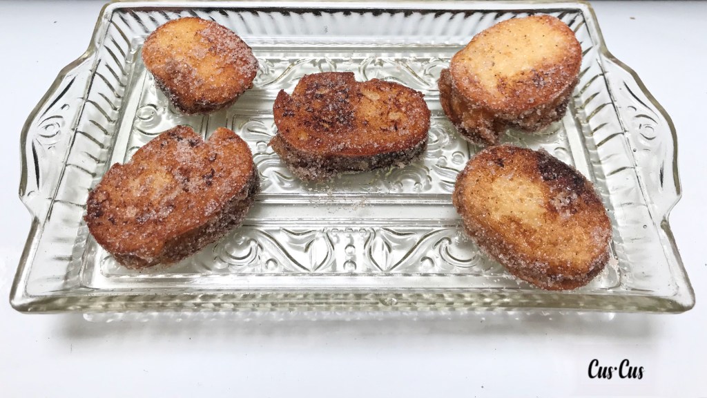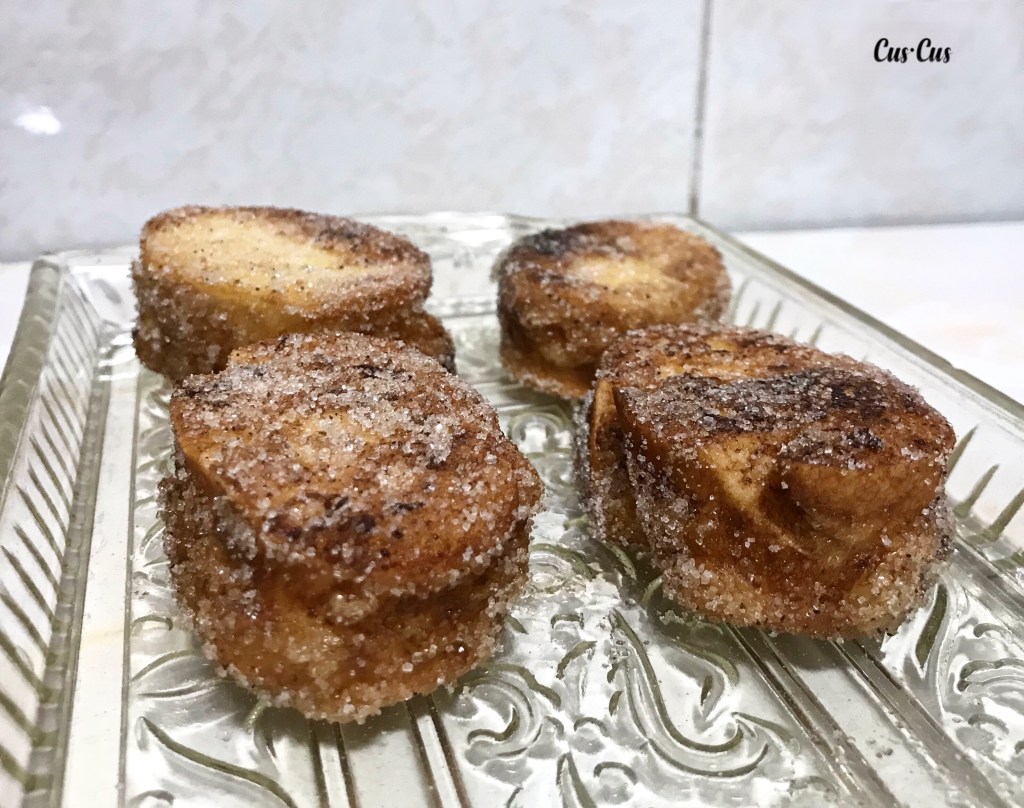 - Por último, mezclamos el azúcar y la canela molida. Rebozamos en esta mezcla las rebanadas por ambas caras.