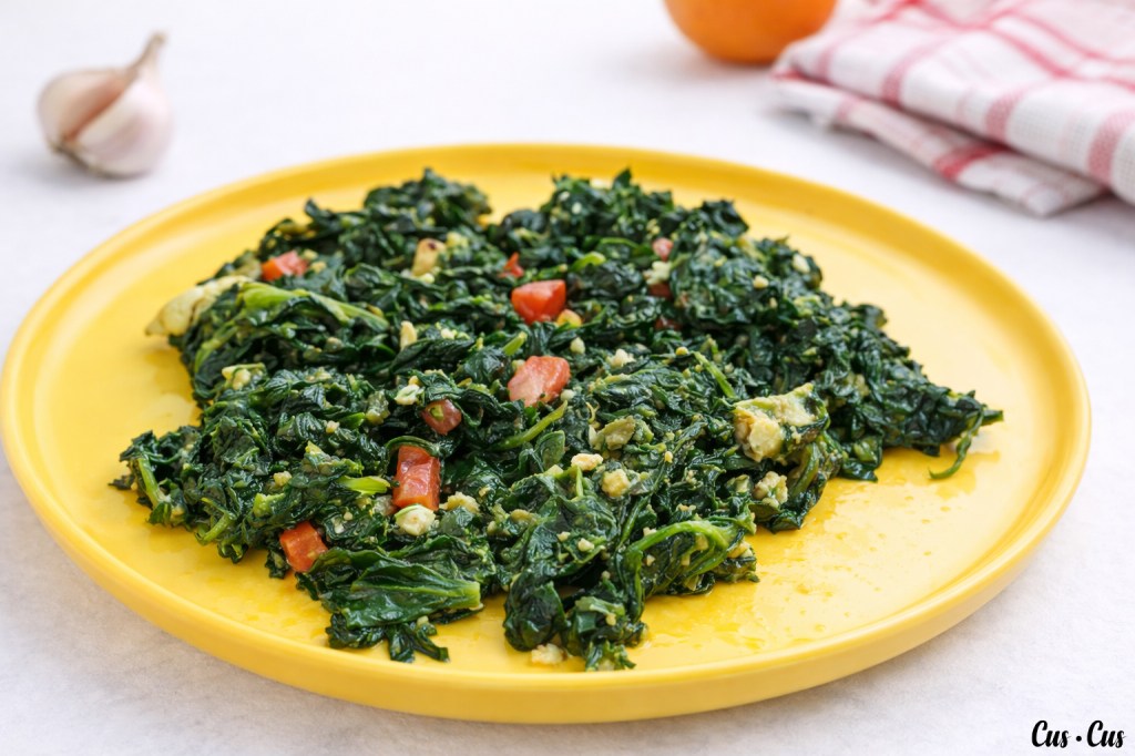 - Calentamos el aceite de oliva en la sartén y echamos el ajo laminado. Una vez dorado, echamos las espinacas y removemos hasta que se descongelen y se cocinen.