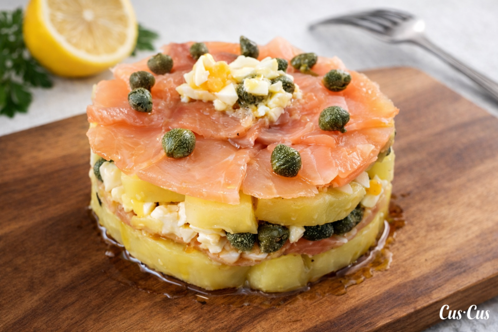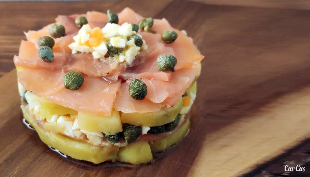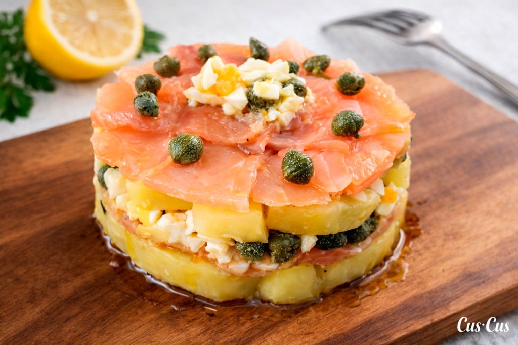 Si decides hacerlo en molde individual o en un cuenco con varias capas, te recomendamos alternar capas de patata + salmón ahumado + vinagreta, ¡y vuelta a empezar!
