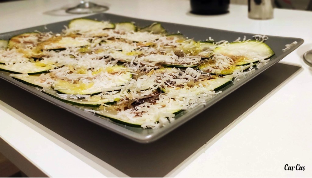 - 1/2 Calabacín partido en láminas lo más finas posibles. Las colocamos en un plato llano de forma que no se tapen demasiado las unas con las otras.