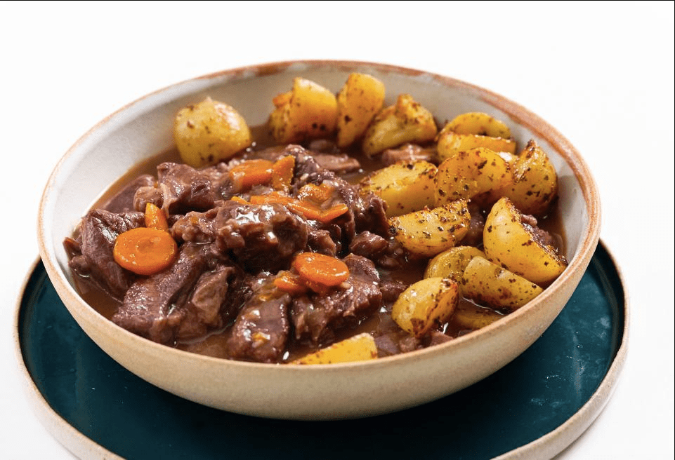 - Agregamos caldo de verduras. Si no tenemos, se añade agua hasta que cubra la carne y haya espacio después para cocer las patatas.