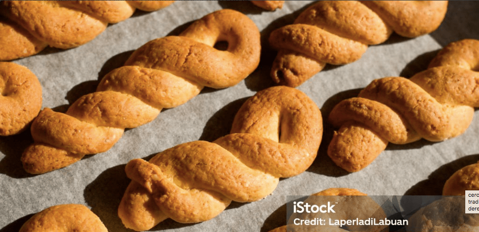 - Formar las trenzas: moldear la masa en forma de cordel de unos 8 cm de largo, doblar por la mitad y enrollar los dos cabos.